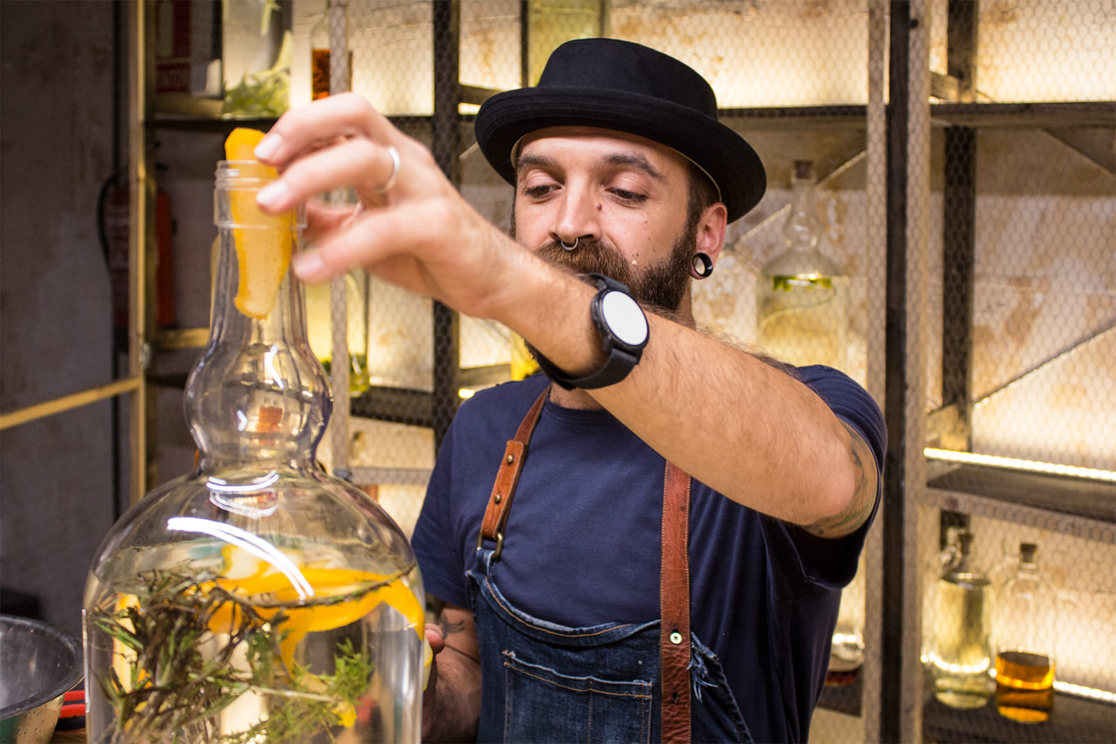 De hecho, ha seleccionado destilados básicos de proveedores con renombre, y a partir de ahí ha elaborado sus propios rones, ginebras o wiskies, mezclándolos con ingredientes naturales como hierbas, frambuesas, arándanos, canela, palos de regaliz… El resultado son precisamente las botellas que están en los estantes y que funcionan además a modo de decoración, mientras se macera todo junto.