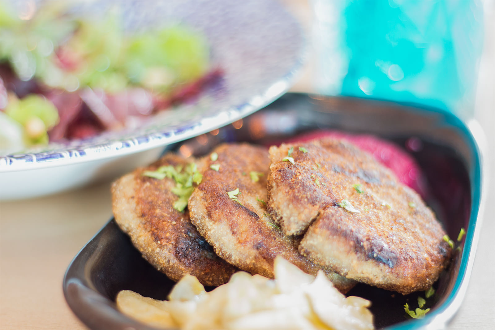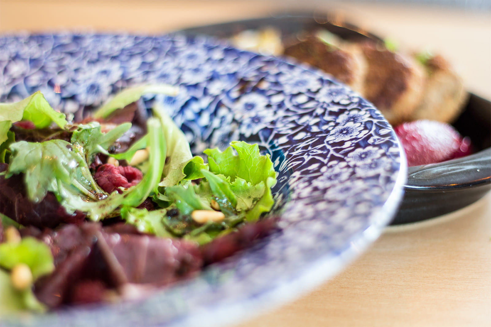 Luego ya sí, llegaron los entrantes. Empecé a mover el bigote con la ensalada Mariposa y con el Recuerdo de la Abuela. La receta de la ensalada sustituye las típicas salsas y vinagretas por frambuesas. Me resultó muy fresca y buena para acompañar al otro plato, unos filetes rusos sabrosos y con acompañamiento de encurtidos y remolacha. Los filetes rusos de mi abuela son bastante diferentes, pero los de la abuela de Max fueron igualmente bienvenidos.