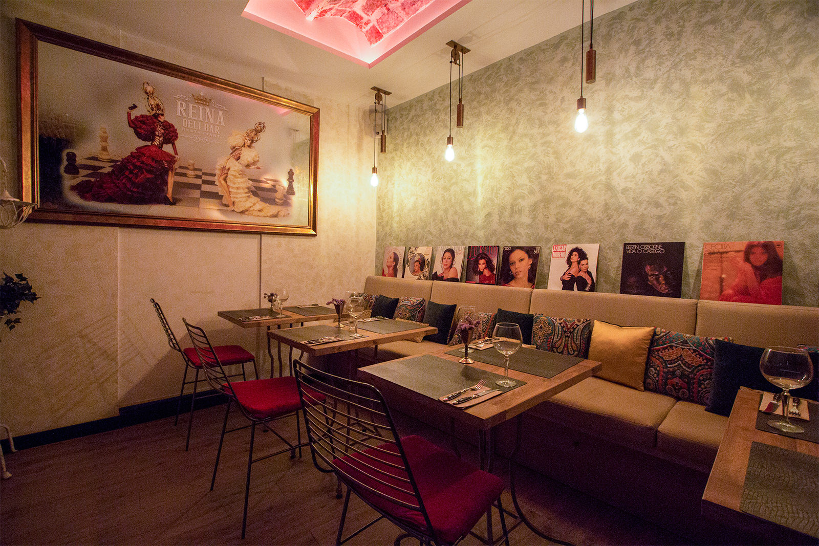 Si no recuerdo mal, hay cuatro mesas en la planta de calle y otras cuatro en la de abajo, en la que también puedes encontrar un reservado. Arriba puedes comer tanto en la barra como en las mesas, en un ambiente más informal. Pero si lo que buscas es un entorno íntimo, te recomiendo una de las mesas de abajo con su luz tenue. Si vais muchos, tampoco hay problema; tienen un reservado con capacidad para diez personas, perfecto para alguna reunión más numerosa. Y si vais a montar una buena, cierran toda la planta de abajo para ti y tus amigos.