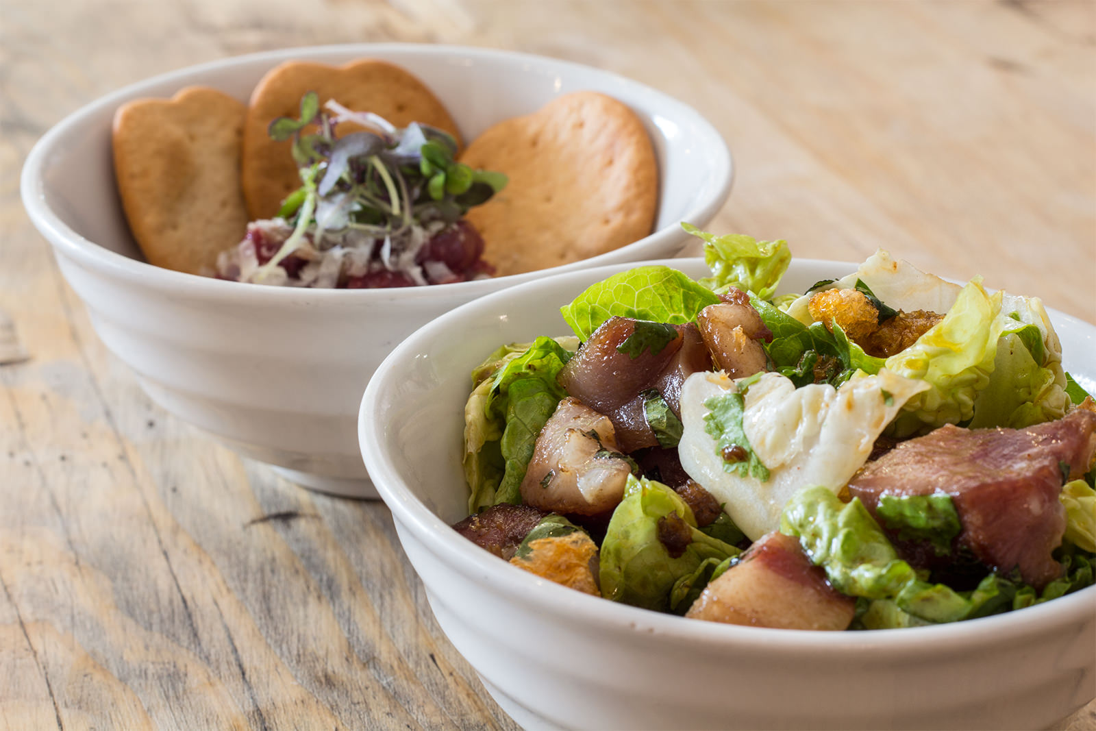 Para terminar esta pequeña cata improvisada, pedí un par de cuncas de carne: Tartar de vaca gallega y Cachelos bravos con panceta. Carne sabrosa para el tartar y panceta con la mínima grasa posible en ensalada que hace que no sea un plato pesado. Junto con una buena copa de vino tinto Ailalá, porque sí, también hay vino tinto Ribeiro.