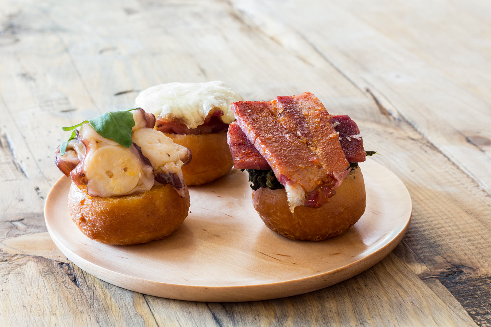 Para hacer punto y seguido, pedí los Makipanes creación de Pepe Solla: unas tapas cuya base es de bollo gallego coronado con tres opciones: lacón y grelos, bacon y queso, pulpo y ajada. Y me pedí las tres 🙂 . Están en ese punto que no sabes si se comen de un mordisco o dos porque vienen bien cargaditos.