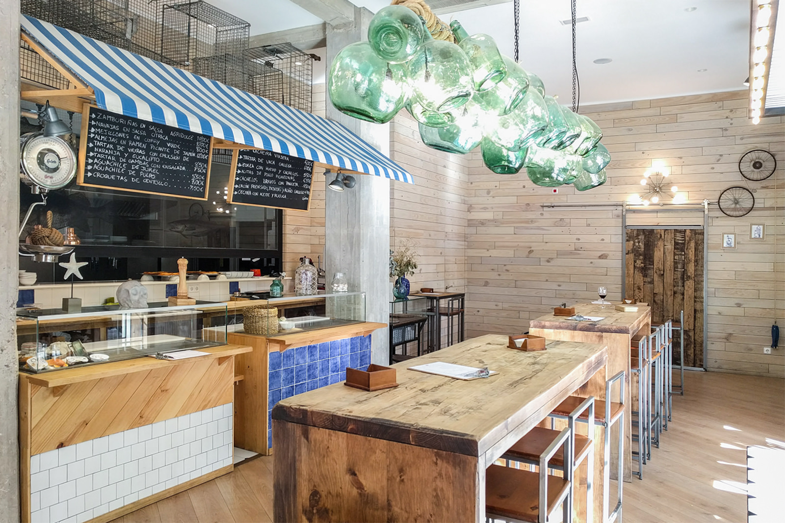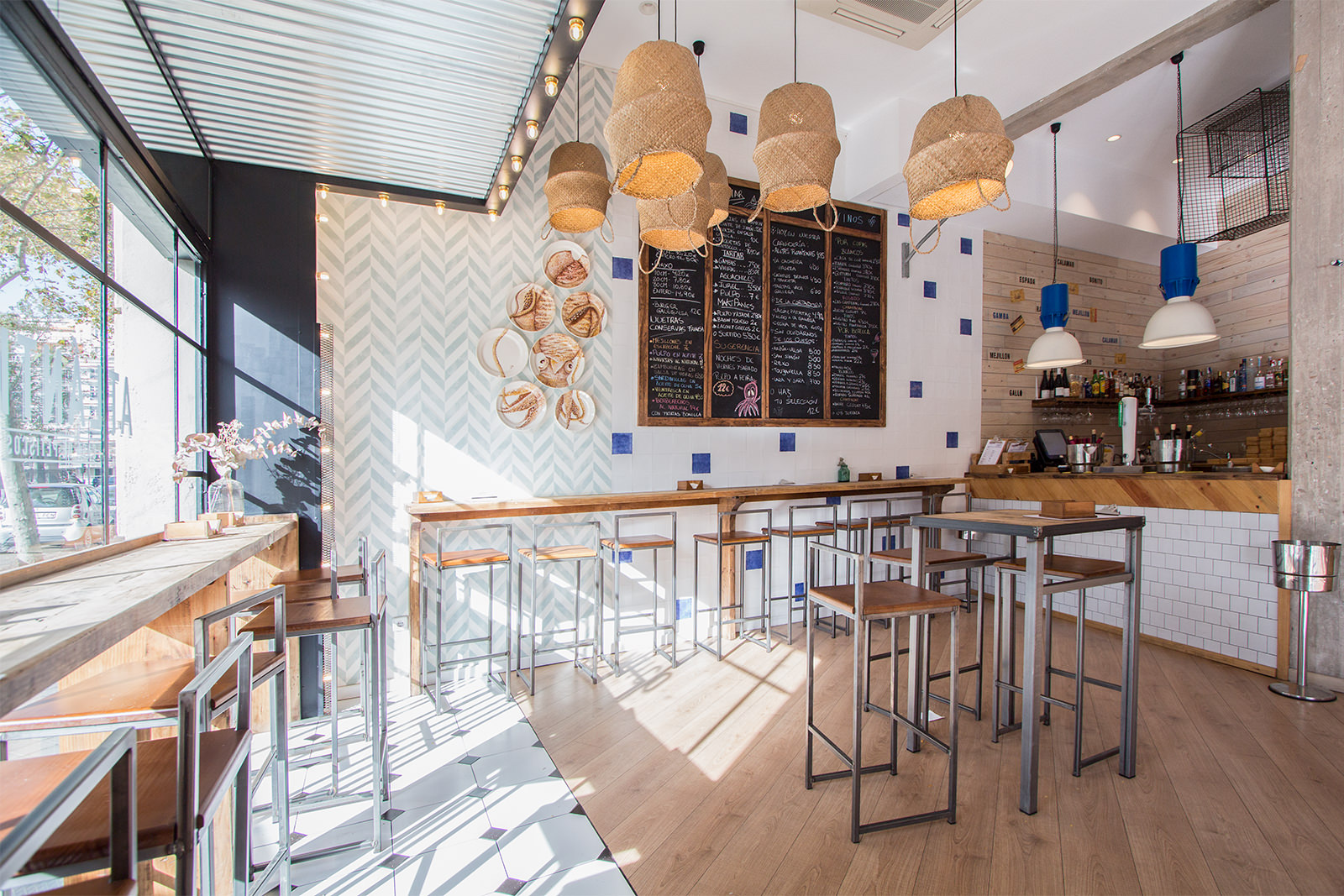 Lo que más me gusta del local es que es súper amplio y muy luminoso. Tiene unos grandes ventanales por los que entra el sol a raudales y que tienen vistas al parque más famoso de Madrid. Todo son mesas altas con taburetes, perfecto para picotear, y además, puedes ver cómo preparan los platos ya que su cocina es abierta y a la vista de todos.