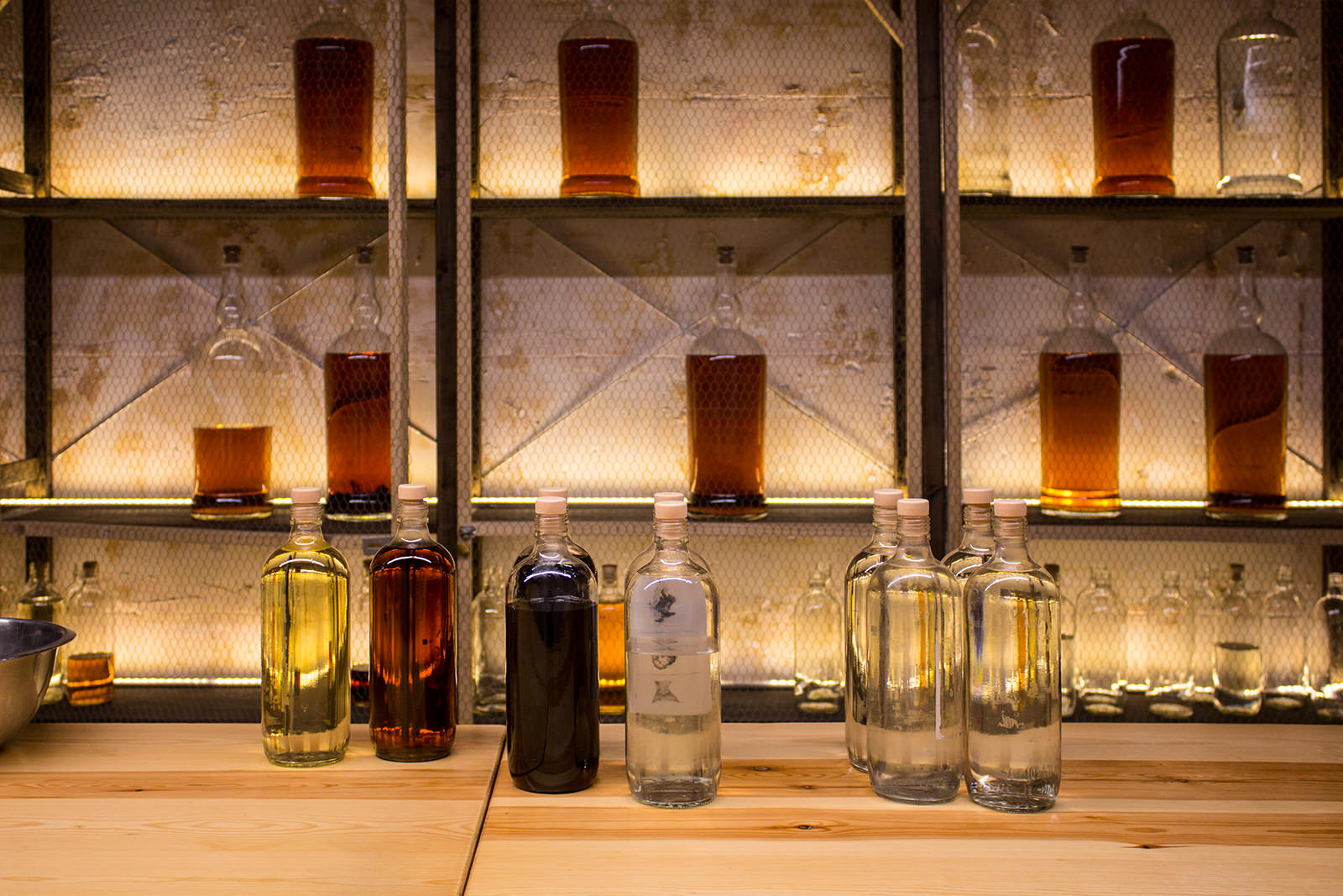 In fact, he has selected basic distillates suppliers, and he has developed his own rums, gins or wiskies, mixing them with natural ingredients such as herbs, raspberries, blueberries, cinnamon, licorice sticks … The result is precisely the bottles that are on the shelves working as a decoration, while all macerate together.